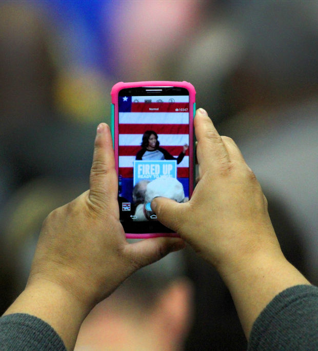 As the first lady took the stage and hugged the trio of candidates there, she quickly noticed that Bustos was taking photos with her cellphone.
